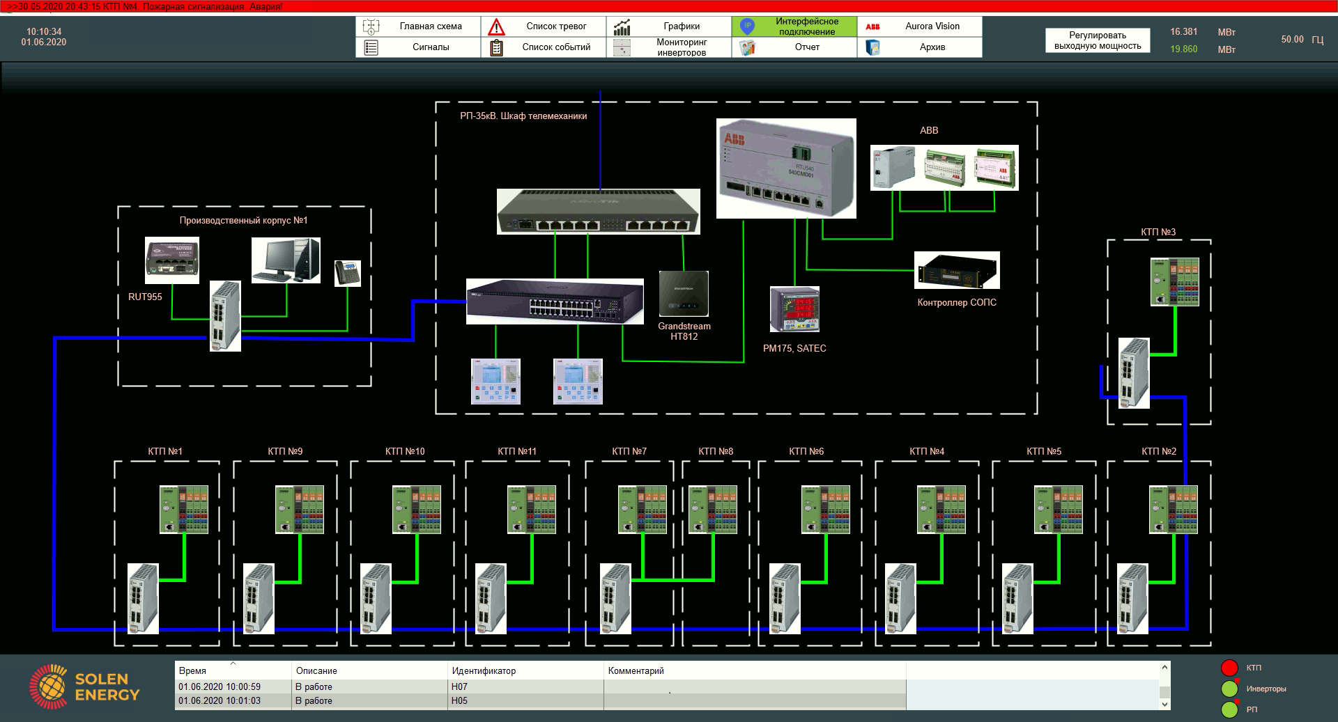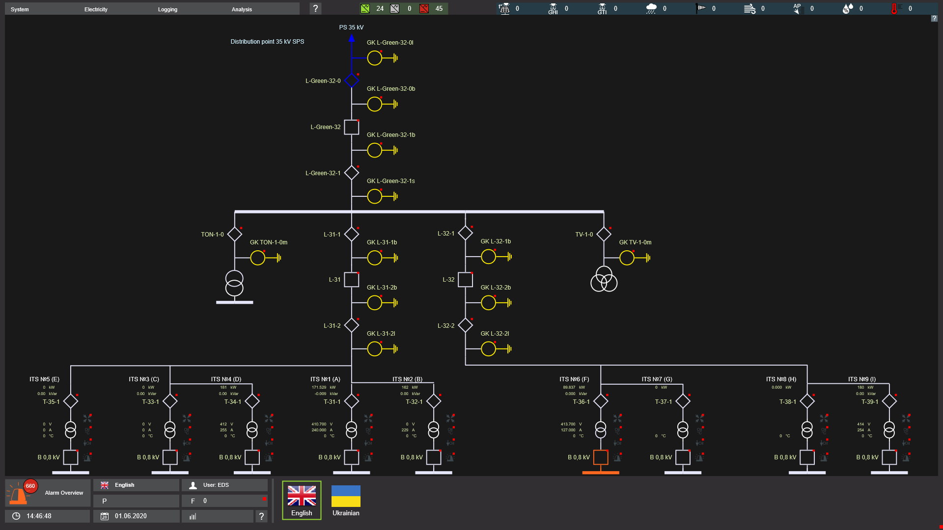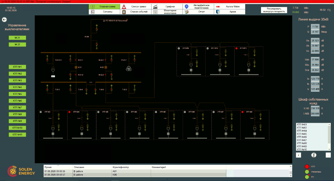 Екран представляє однолінійну електричну схему з індикацією потужності з кожної КТП, керуванням вимикачами і відображенням стану вимикачів, роз'єднувачів і заземлюючих ножів відповідно до європейських стандартів.