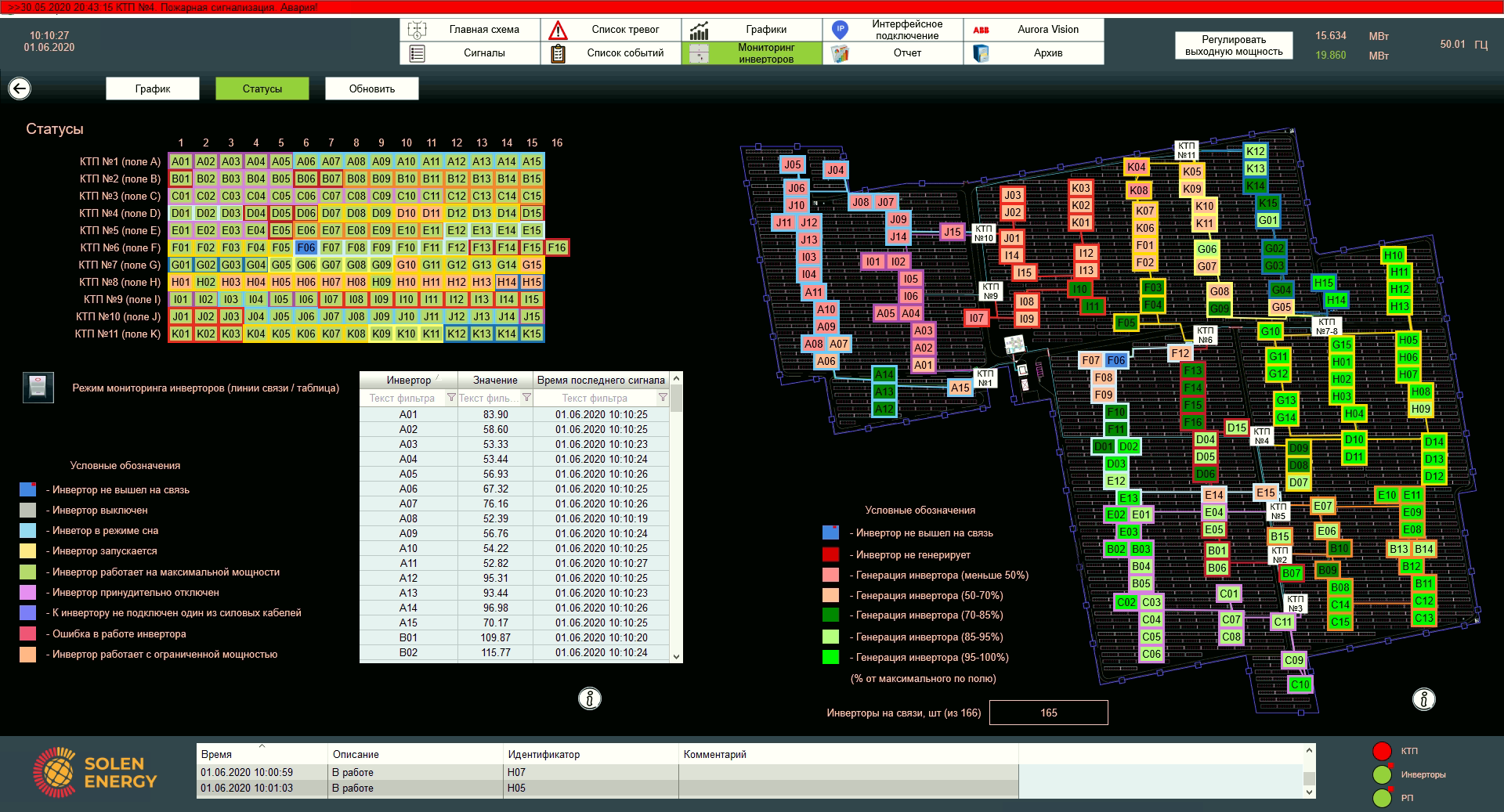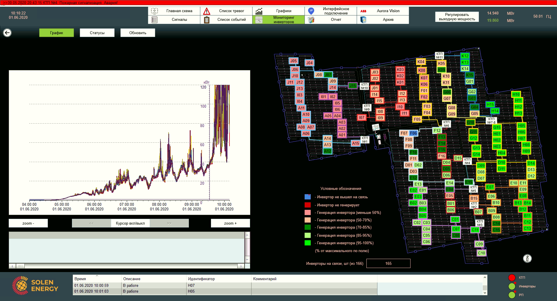 Тут зібрана уся поточна інформація по обладнанню, розташованому безпосередньо на полі. В правій частині зображені інвертори і їх розташування на полі. Колір інформує оператора про продуктивність генерації інверторів. При відсутності зв'язку з інвертором символ буде відображуватись синім кольором. В лівій частині екрану можна відстежити потужність інверторів за графіком.