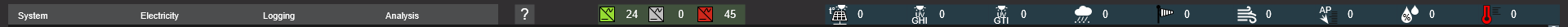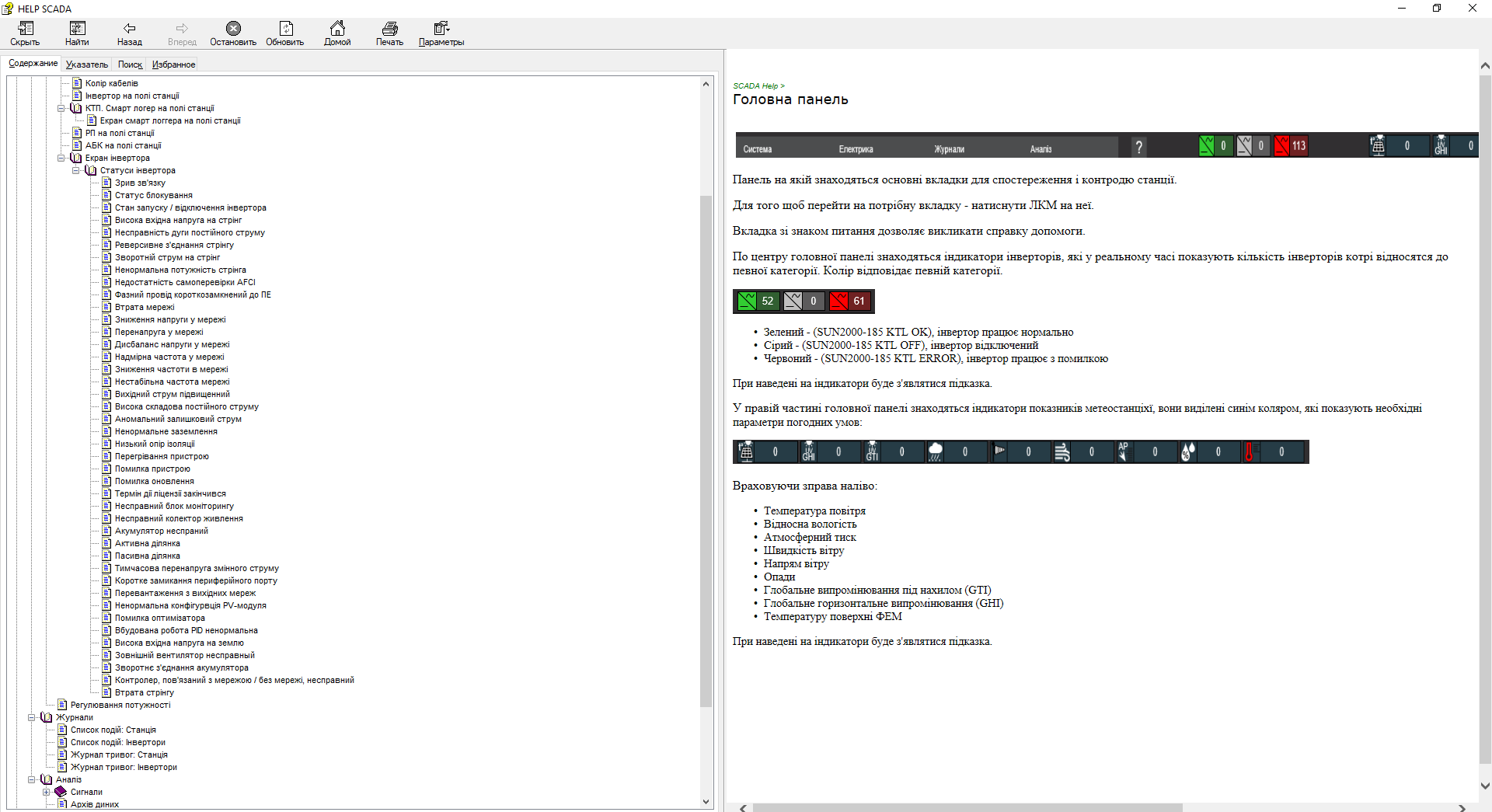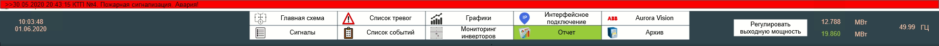 Навігаційна панель, розташована у верхній частині інтерфейсу, дозволяє перемикатися між екранами, відстежувати кількість інверторів в робочому, відключеному і аварійному стані, відображує дані з метеостанції.