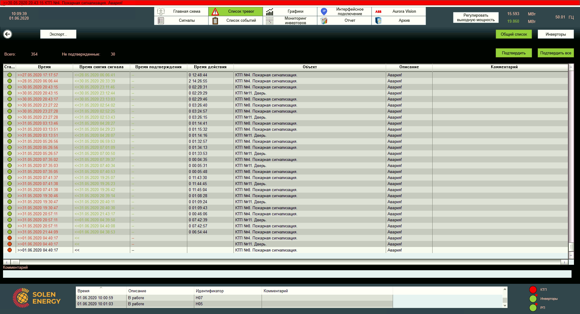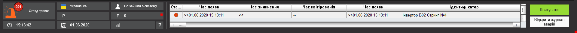 Доступ до журналу аварій на інформаційній панелі дозволяє оперативно підтверджувати аварію або перейти до перегляду повноформатнгого журналу аварій. Глибина архіву аварій в цьому журналі – одна доба.