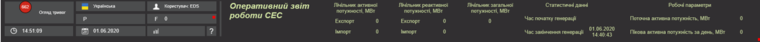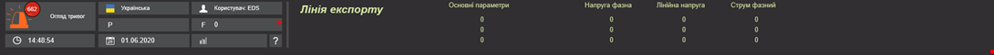 На панелі праворуч відображуються показники електроенергії на лінії видачі: активна та реактивна потужність, струм, фазна та лінійна напруга. В нижній частині панелі знаходяться кнопки швидкого доступу до сигналів КТП.