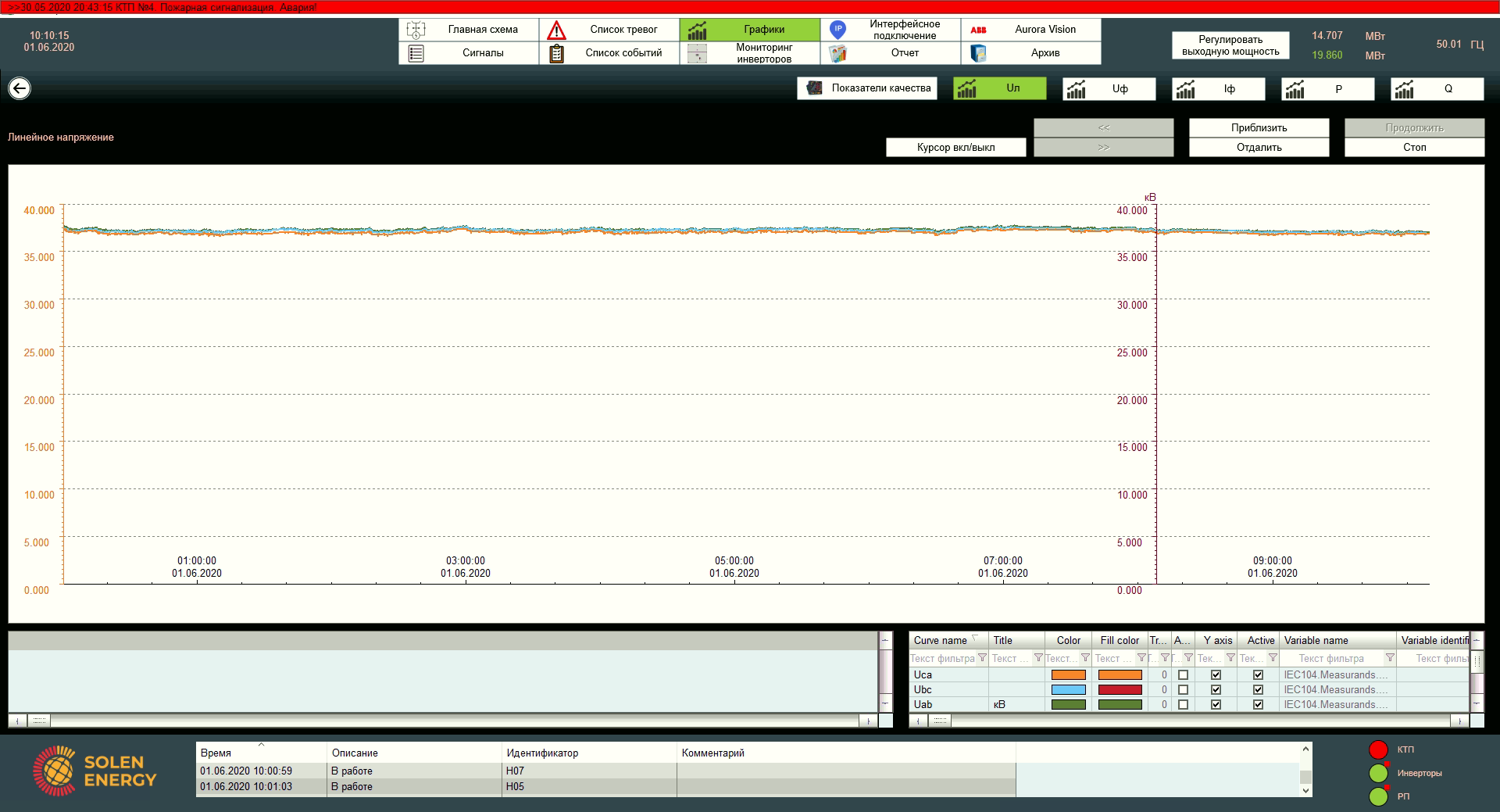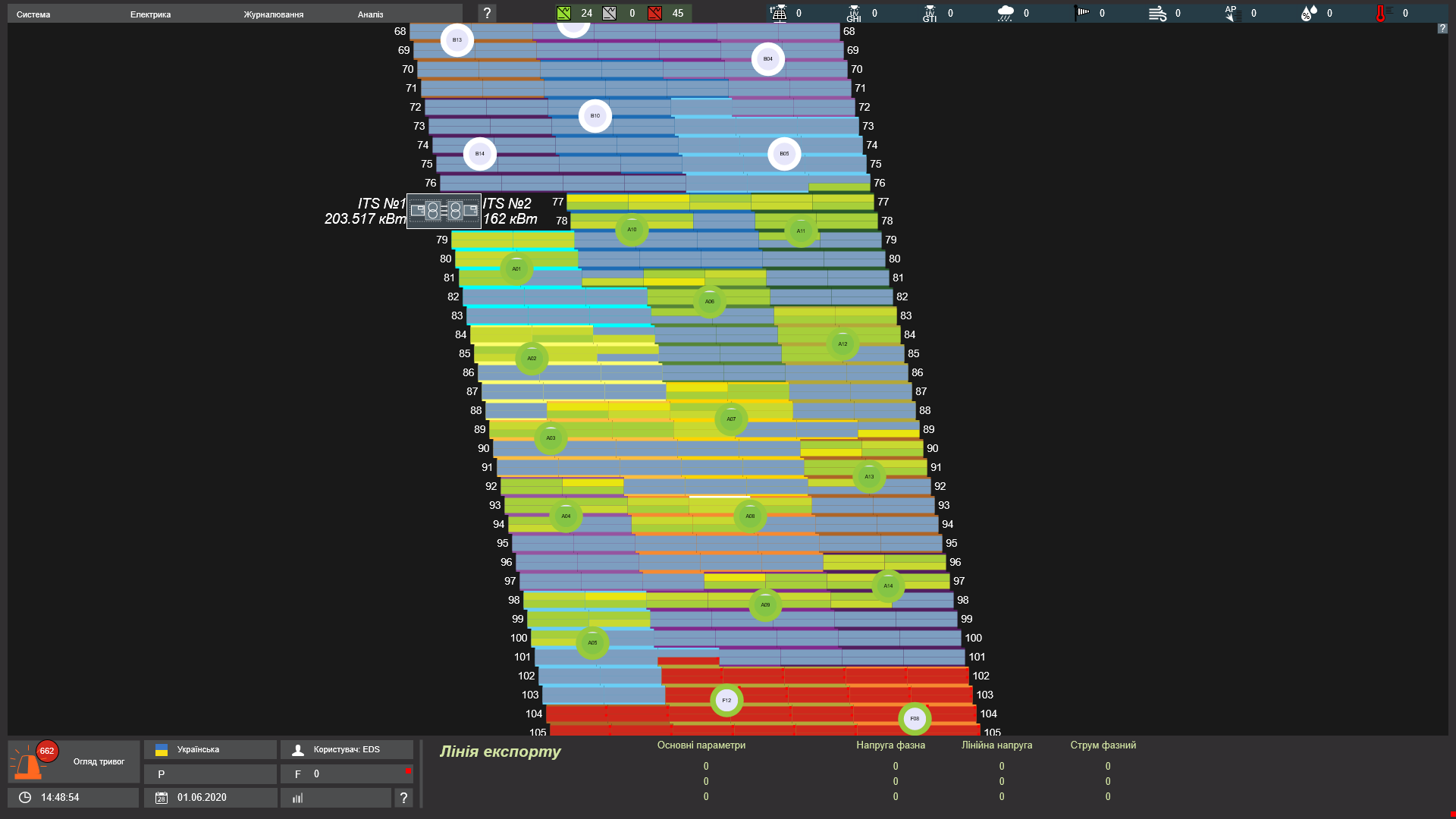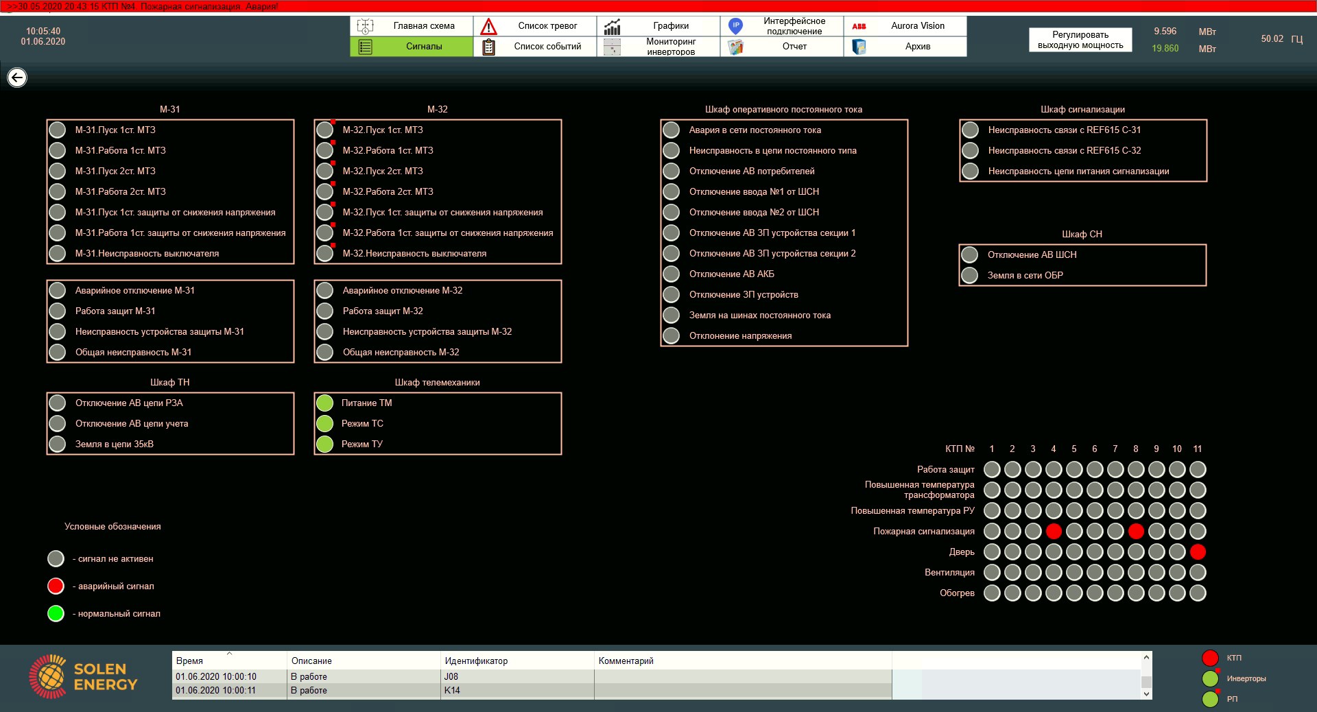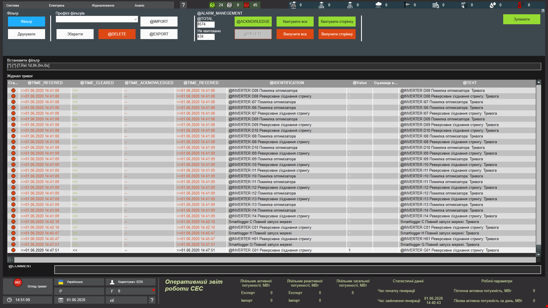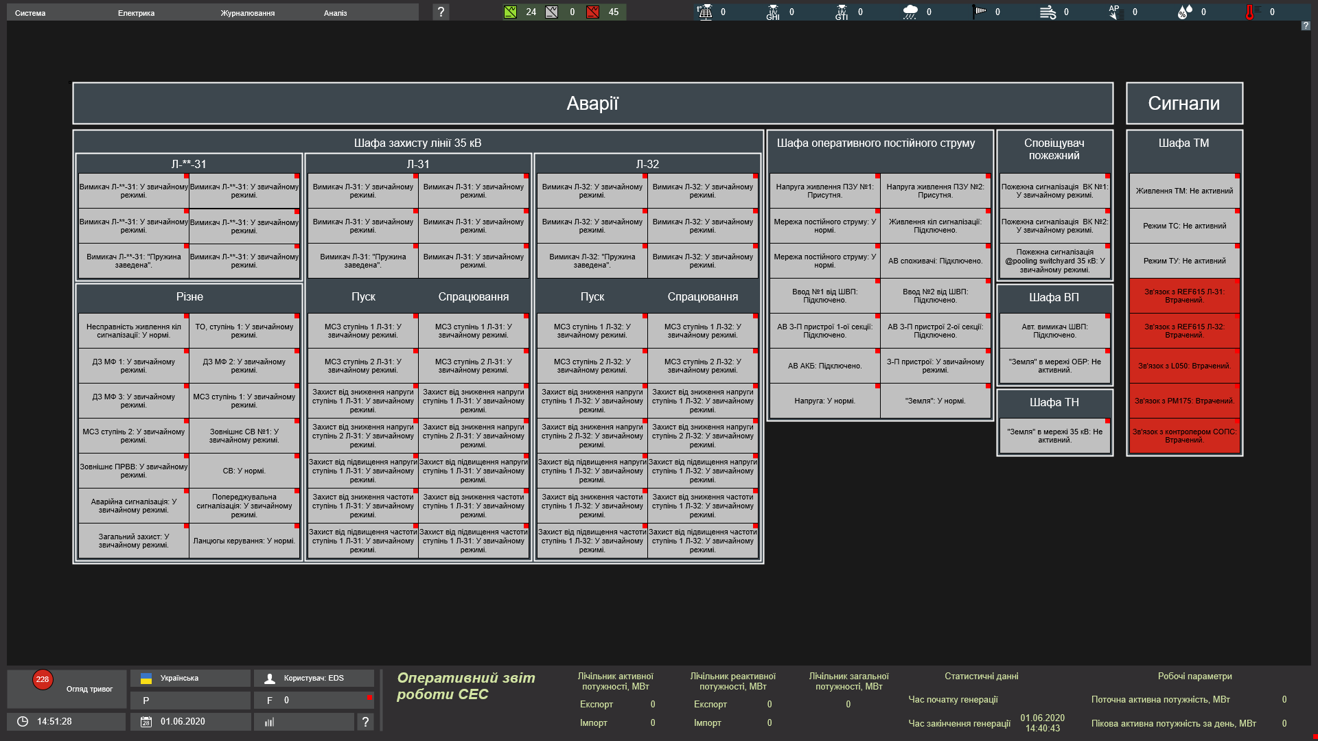 На цьому екрані відображені сигнали станів і аварій зі всієї станції, що дозволяє в онлайн режимі відстежувати поточний стан системи.