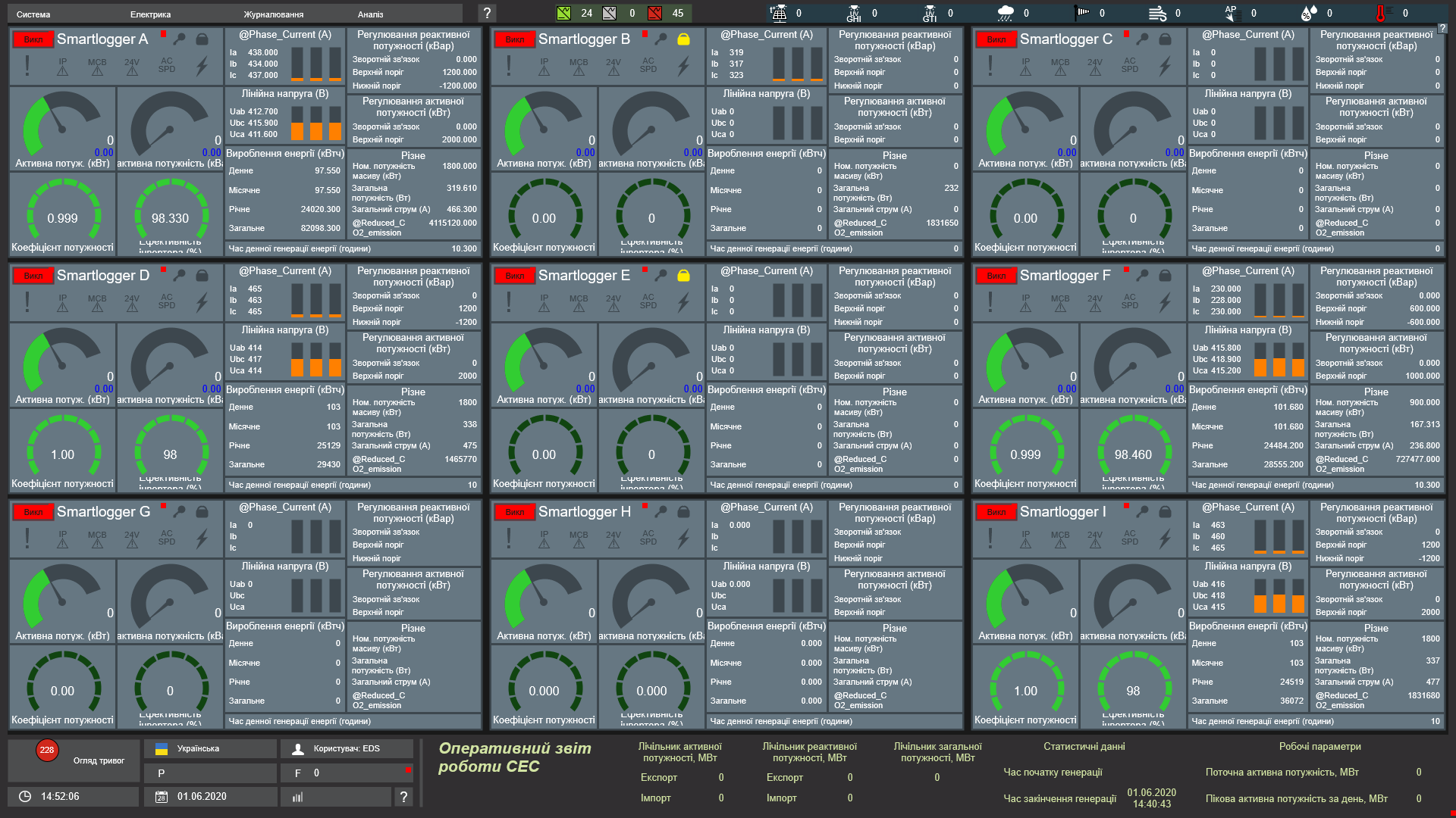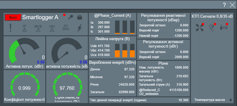 При натисненні на КТП з’являється вікно зведеної інформації по ній, а саме: сигнали, аварії і генерація. Існує можливість перегляду інтегрованої довідки по кожному аварійному сигналу. Тут можна здійснювати безпосереднє керування пристроєм (увімкнення \ вимкнення). На даному прикладі наведено дані з приладу Smartlogger 2000.