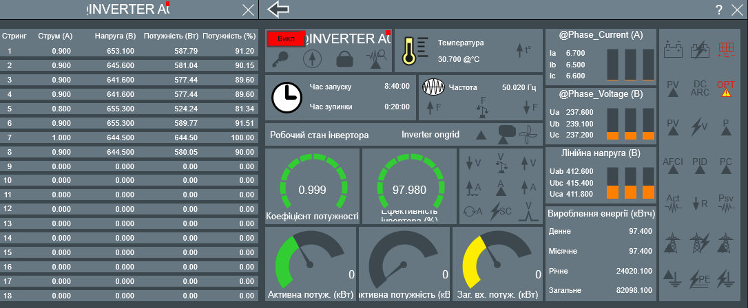 При натисненні на символ інвертора можна потрапити на аналогічне вікно інвертора з сигналами статусів, аварій і вимірювань. Тут доступні засоби керування інвертором і елементи спостереження за роботою стрінгів.