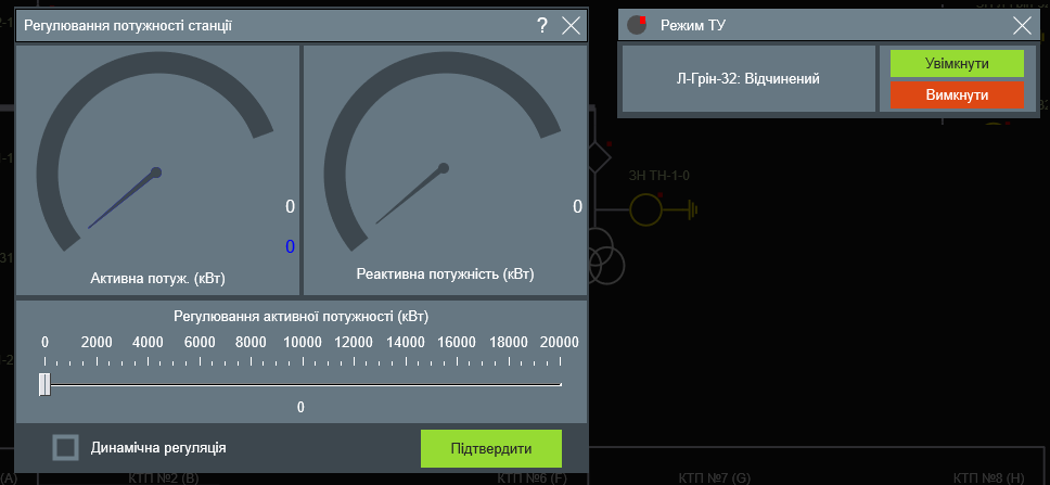 Головна схема має можливість масштабування для візуального збільшення деталізації сигналів. При наближенні екрана відображаються сигнали з КТП: стану та аварійні. Дане рішення дозволяє оператору швидко відстежити наявність аварійної ситуації на КТП та оперативно відреагувати на неї.
