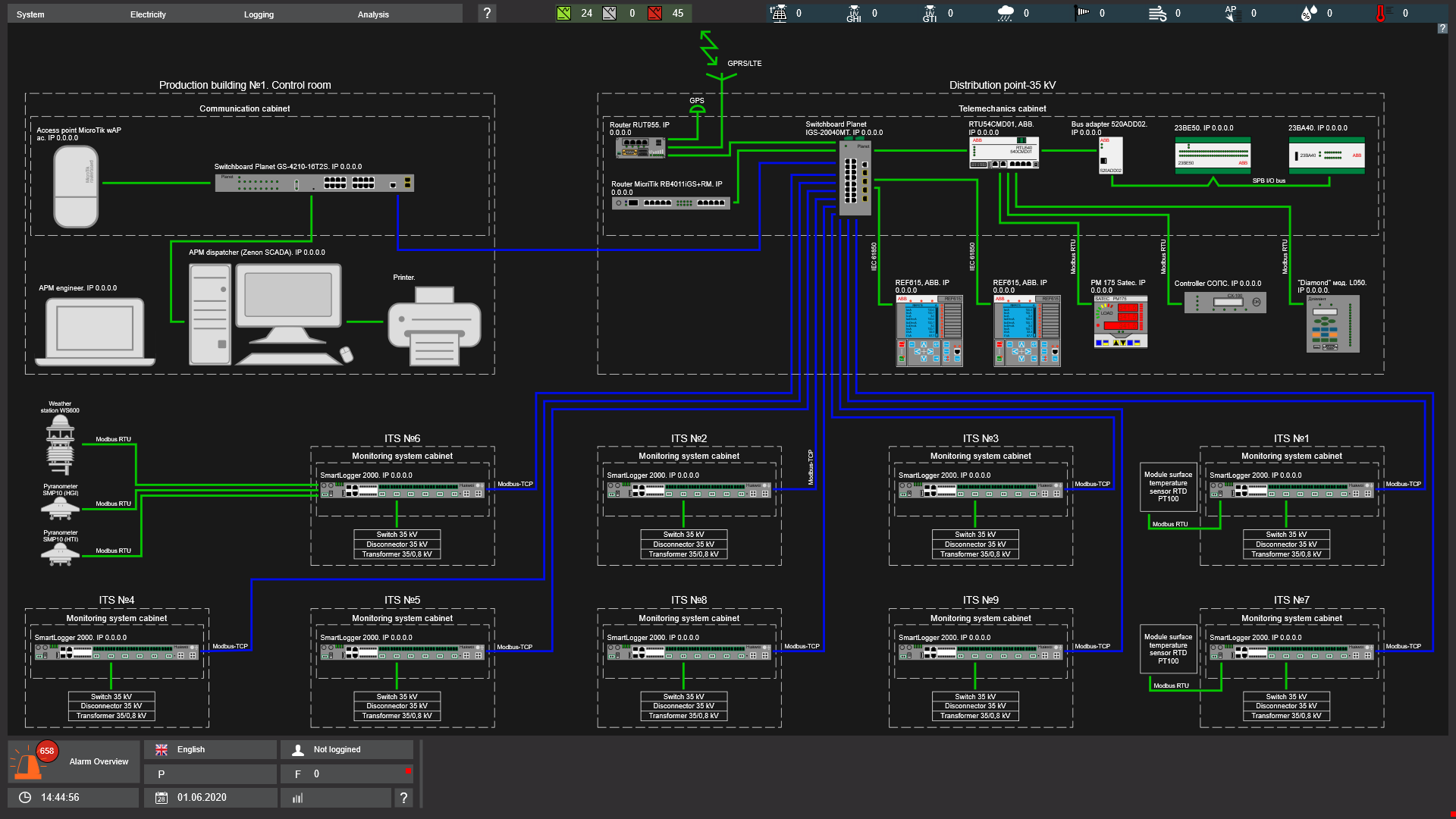 На головному екрані зображена однолінійна електрична схема СЕС, яка відображає реальний стан вимикачів, роз'єднувачів і заземлюючих ножів, а також зафарбовуванням ліній відповідно до поточної напруги на даній ділянці. На наведеній схемі лінія 35 кВ – має коричневий колір, лінія 0,4 кВ – сірий (відповідно до ГОСТ Р 56303-2014).