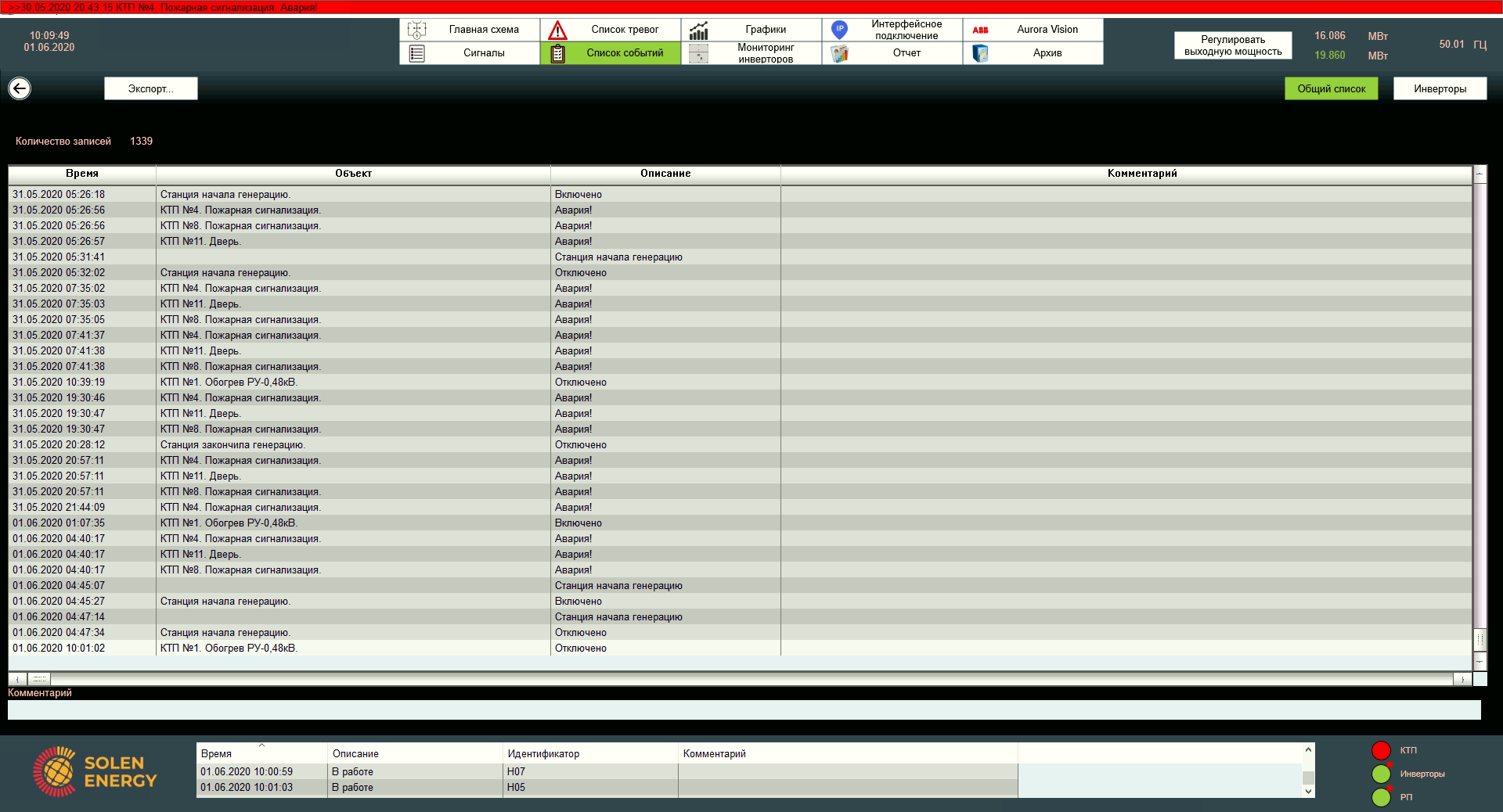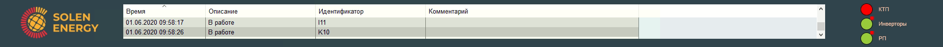 На екрані списку подій відображується журнал всіх керуючих дій оператора чи змін, що відбуваються на станції, записується точний час появи з описом. До кожної події оператор має можливість ввести свій коментар.