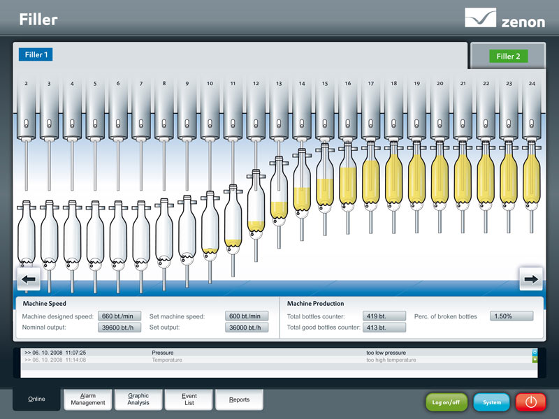 За європейською класифікацією цей процес відноситься до сектору промисловості Food & Beverage (F&B) і об’єднує в собі процеси ополіскування тари, безпосередньо розлив, закупорювання, етикетування, упаковку та проміжний етап виробництва – промивку та дезінфекцію обладнання. Головна складність полягає у тому, що розлив – це конвеєрний процес, різні операції якого виконуються в загальному безперервному режимі. Оптимізація використання обладнання, зменшення часу технологічних пауз та простою – ось головні задачі, вирішення яких дасть змогу суттєво збільшити продуктивність виробництва. Саме на цьому зосередили особливу увагу розробники HMI/SCADA-системи zenon.