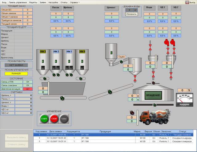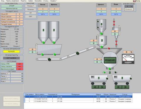 • автоматичне керування процесом виробництва бетону із застосуванням рецептурної технології, створення і редагування рецептів відповідно до заявок;