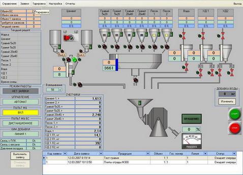 Система управління може працювати в двох режимах: автоматичному і ручному. В автоматичному режимі оператор задає необхідну марку бетонно-розчинної суміші і обсяг замісу, після чого запускає процес на виконання. Система здійснює тарування (корекцію маси тари), вимірює вологість інертних матеріалів і, виходячи з цих даних, проводить автоматичну корекцію рецепта. Далі здійснюється процес завантаження окремих компонентів в змішувач.