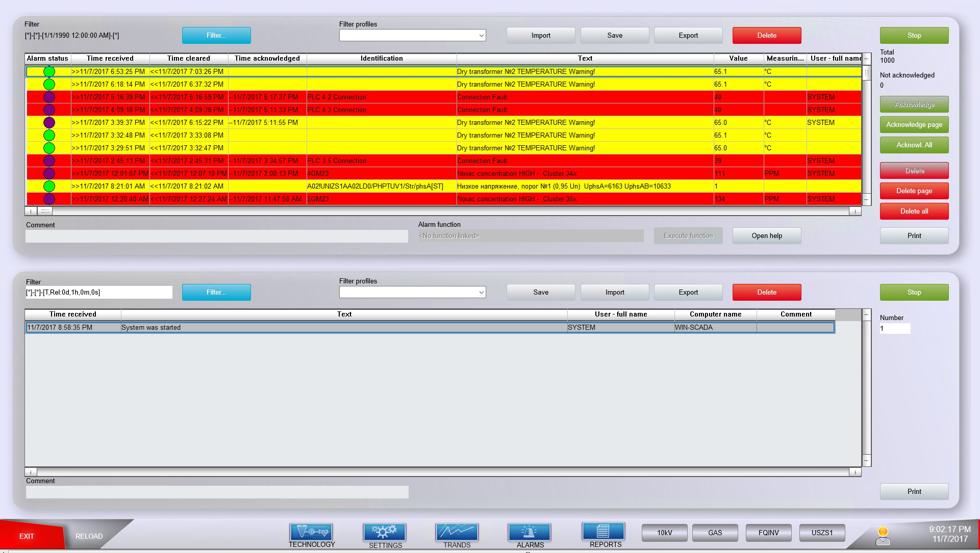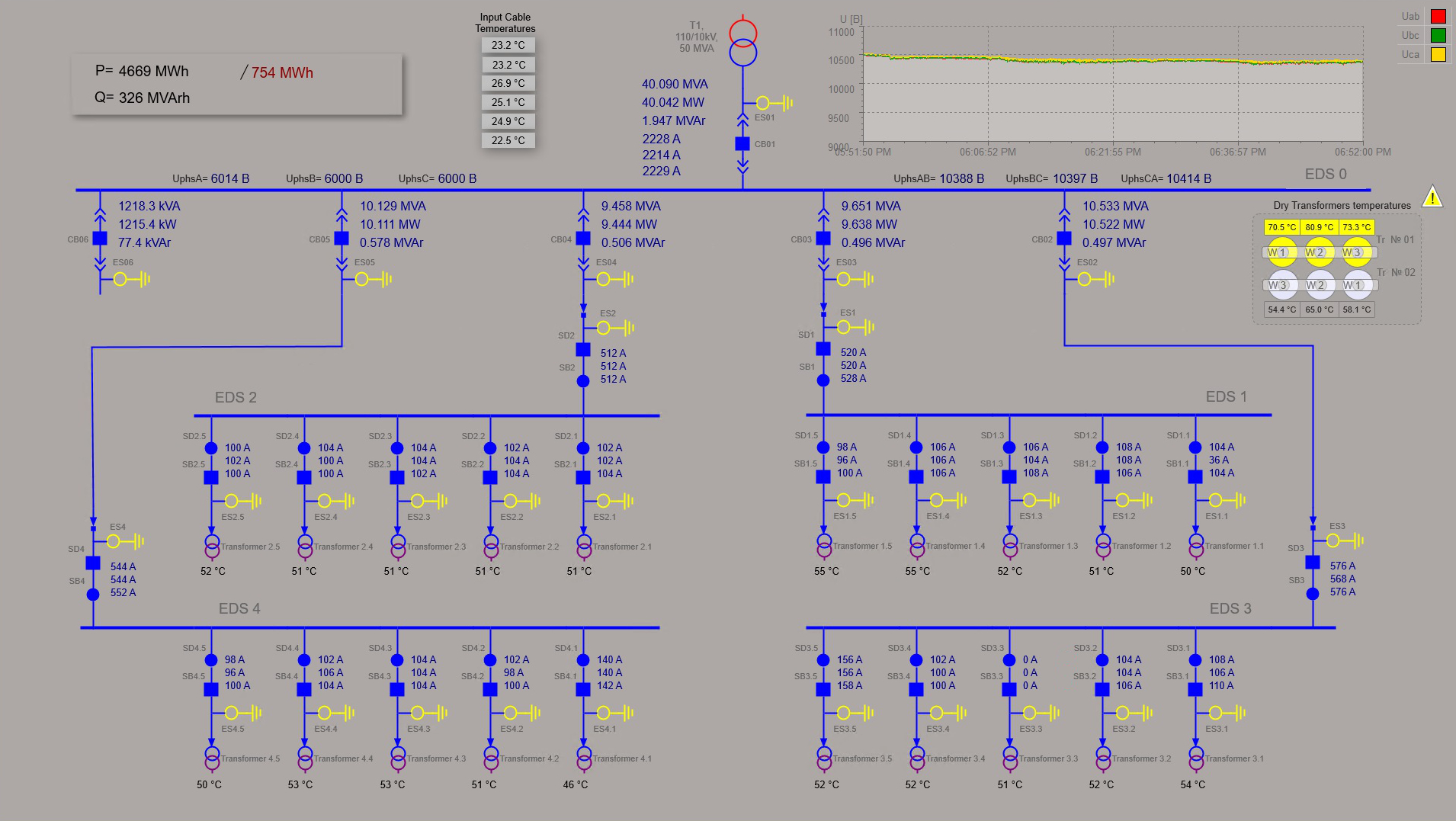 Головна мнемосхема ДЦ розташована на трьох моніторах, на четвертий монітор виводиться інтерфейс аварій (Alarms) і подій (Events) системи.