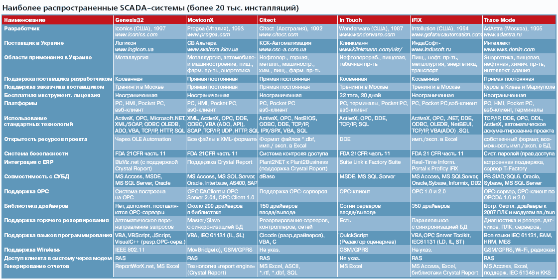 Наиболее распространенные SCADA cистемы (более 20 тыс. инсталляций)