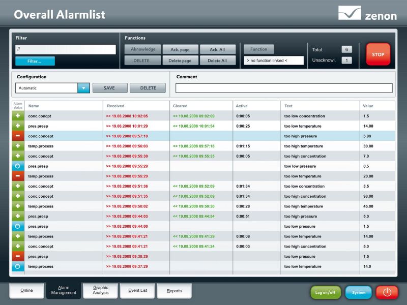 Вікно тривог відображає всі тривоги, які з'являлися в системі протягом процесу виробництва. Тут знаходиться інформація про поточний стан тривоги, часу її появи / зникнення / підтвердження, текст характеризує тривогу, значення параметра, ім'я користувача, коментар оператора. Використовуючи архів, оператор може переглядати тривоги по кожній партії продукції. При необхідності, під час появи тієї чи іншої тривоги, існує можливість конфігурувати автоматичне виконання певної функції: генерація SMS повідомлення, подача звукового сигналу, запуск на виконання скрипта і т.д.