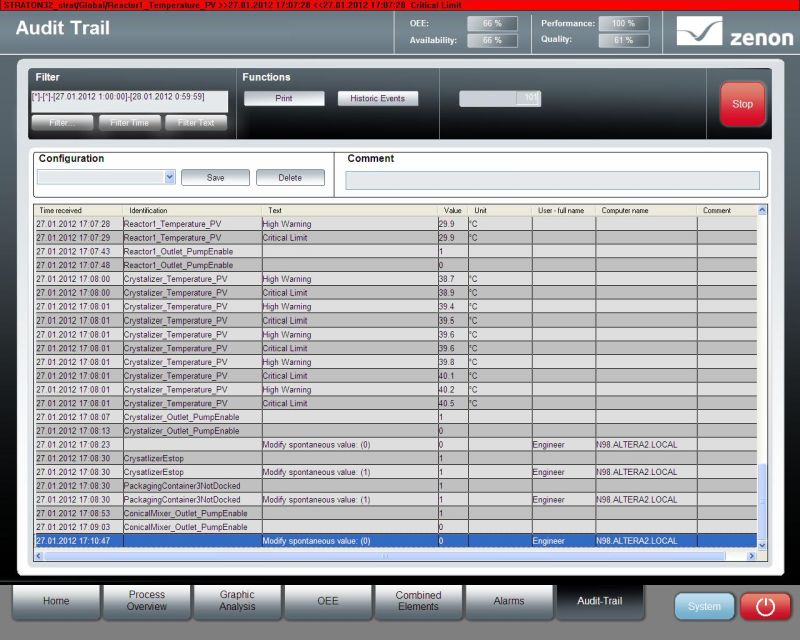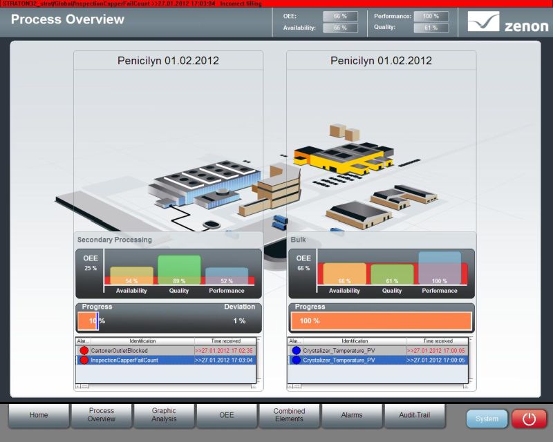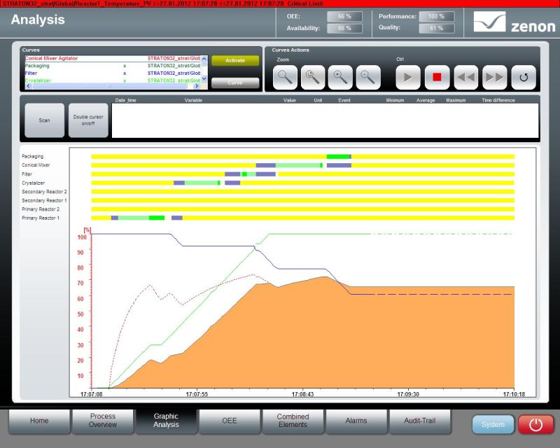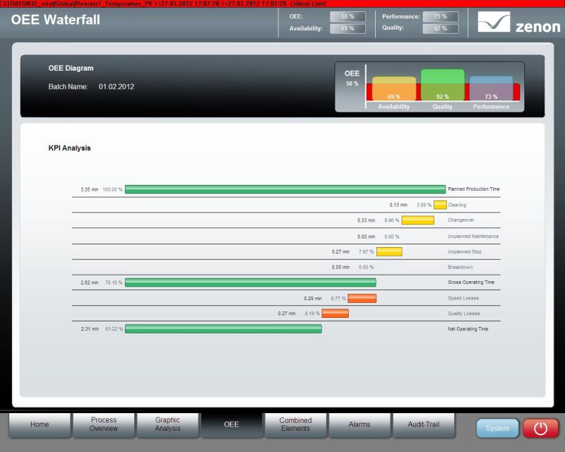 Найбільш важливим параметром виробництва є ефективність процесу. Його розрахунок здійснюється на базі значень ключових індикаторів, таких як час простою, завантаженість обладнання, втрата якості, операційний цикл. zenon автоматично обчислює необхідні індикатори і в он-лайн режимі динамічно відображає результуючу діаграму виробництва.