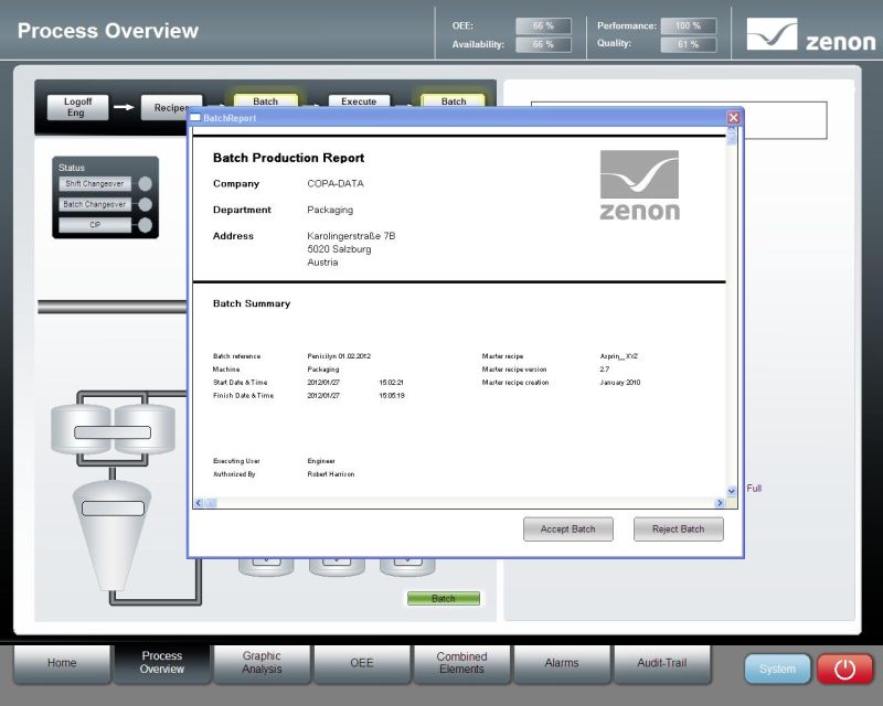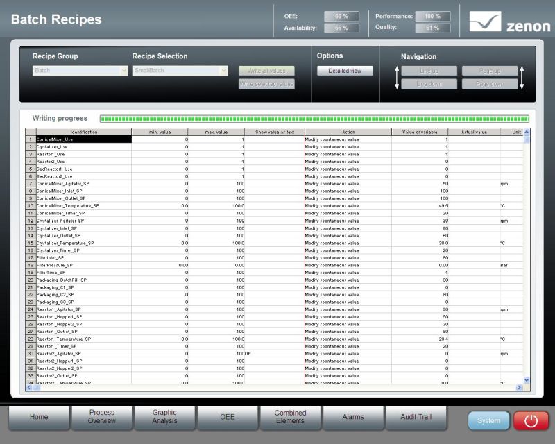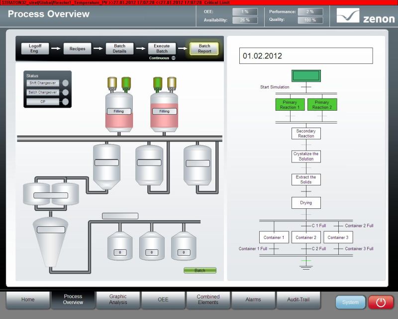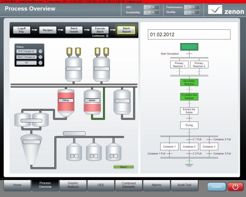 Завдяки широким можливостям динамічного подання zenon, хід технологічного процесу відображається в інтуїтивно-зрозумілій формі. У міру проходження етапів виробництва, продукт у вигляді рухомого потоку переходить з однієї ємності в іншу.