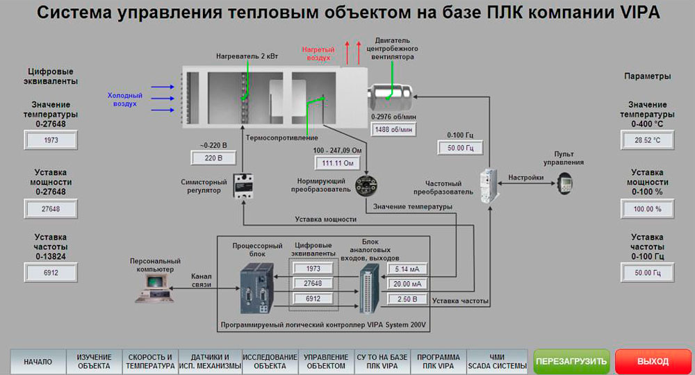 Стенд предназначен для исследования алгоритмов функционирования ПИД регуляторов контроллеров VIPA. Сам контроллер подключается к компьютерной сети Ethernet с человеко-машинным интерфейсом, разработанным на базе SCADA системы zenon. Данное решение позволяет более глубоко познакомиться с принципами работы ПИД регулятора и наглядно увидеть его блочную реализацию. В ближайшее время будет выполнена разработка соответствующих методических указаний, и этот стенд будет внедрен в такие дисциплины, как "Теория автоматического управления", "Промышленные контроллеры", "Системное программирование".